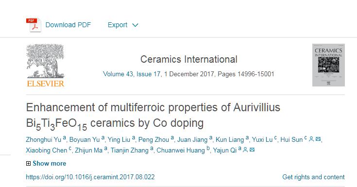 近日,材料学院章天金教授研究团队的2014级材料物理系本科生余中辉同学在章天金、祁亚军等老师的指导下,在材料科学领域国际期刊Ceramics International (SCI 2区期刊,IF = 2.986)上,以第一作者身份发表了题为“Enhancement of multiferroic properties of Aurivillius Bi5Ti3FeO15 ceramics by Co doping”学术论文,该生今年保送至北京大学继续深造。 单相多铁材料因同时具有铁电、铁磁等性能,在传感器、自旋电子器件和信息存储等方面都具有重要的应用前景。由于过渡金属氧化物中铁电性和磁性对过渡金属离子d轨道填充方式的不同要求导致了这两种有序状态的互斥性,因此室温下具有多铁性的单相化合物非常少。本研究中选用铁电居里温度高,剩余极化大的Bi5Ti3FeO15天然超晶格为研究对象,通过磁性Co离子掺杂,调控晶格畸变,使得Bi5Ti3FeO15的反铁磁性转变为铁磁性,实现了磁电耦合效应增强,获得了大的磁电耦合系数。这类磁电耦合增强的多铁材料在传感器、磁存储等器件的小型化和多功能化有重要的应用前景。