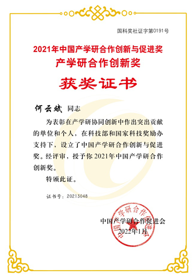 何云斌教授荣获2021年中国产学研合作创新奖 | |