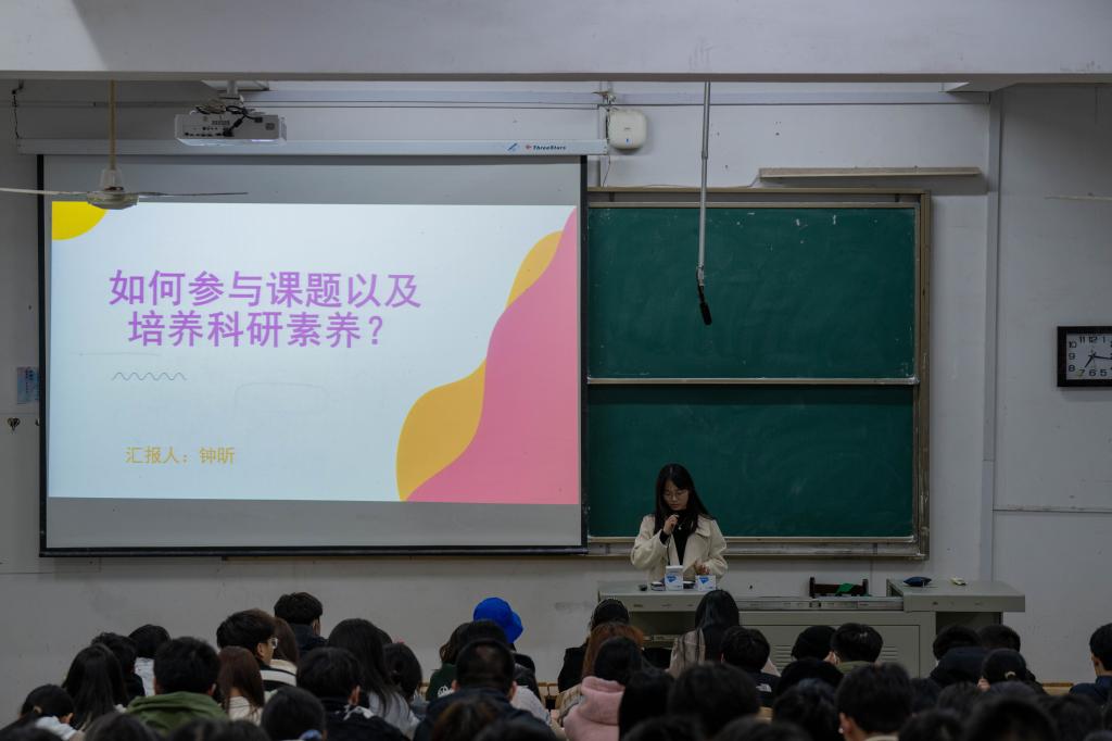 学习生活上,2022级材料学专业博士生钟昕为在场员工重点讲述了如何参与课题竞赛并就如何提高科研素养对员工提出建议,一是文献阅读,二是实验操作学习,三是测试与表证,四是软件学习。2019级材料科学与工程专业周雨琪则就大二的专业分流进行了具体介绍。其他多位学长学姐也热情地分享了众多学习方法和生活经历。